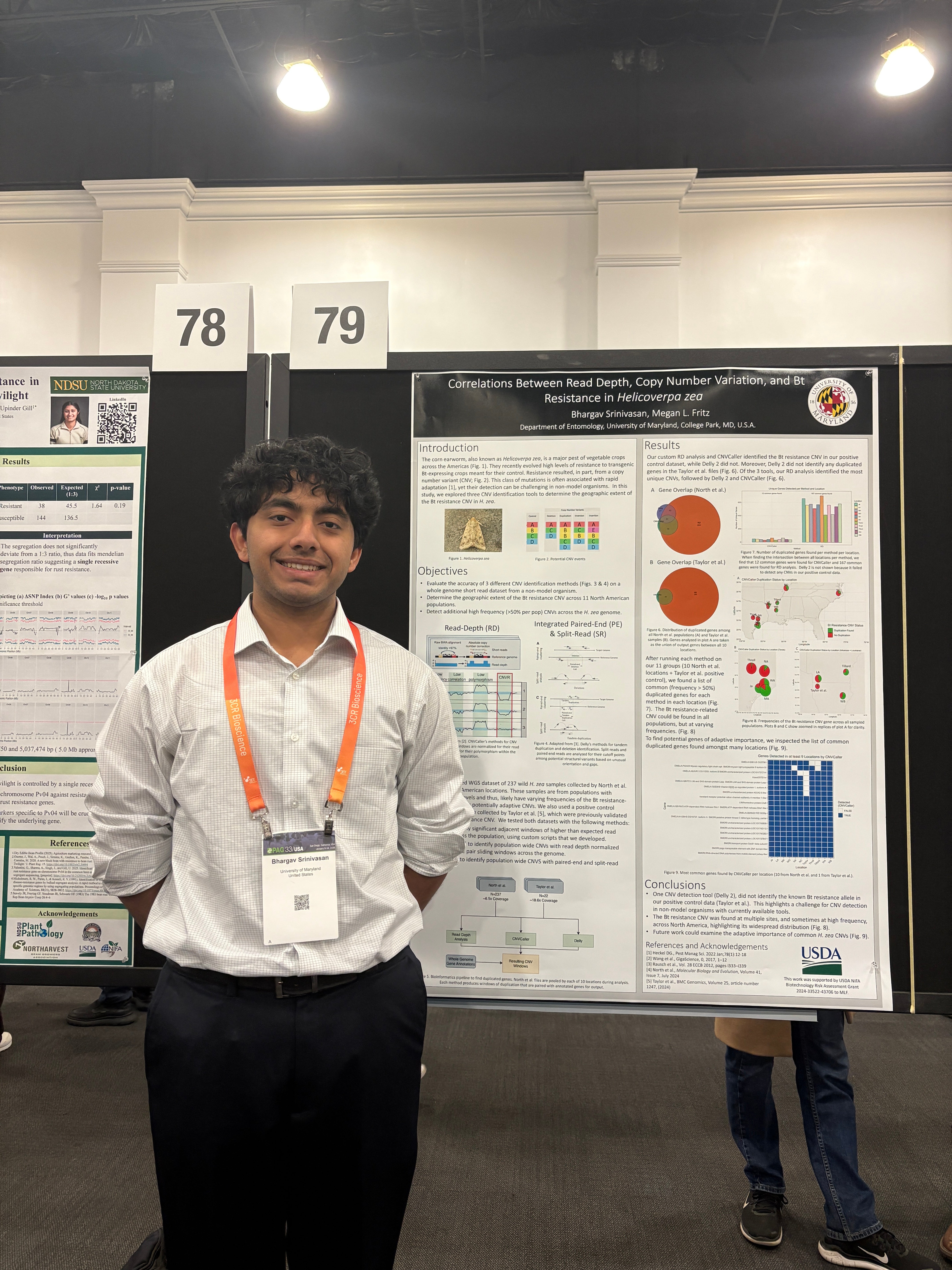 “From January 9th to 14th, I travelled to San Diego to share some of my research in the Fritz Lab at the International Plant and Animal Genome conference. My poster, titled 'Correlations between read depth, copy number variation, and Bt resistance in Helicoverpa zea,' focused on my undergraduate thesis work as part of the Entomology undergraduate honors program. The conference was an amazing opportunity to discover and learn about new work and meet professionals in the field of bioinformatics and computational biology. I hope to use what I learned at the conference in my thesis while also applying novel methods in future work down the line. Additionally, I am sure that this experience will be largely beneficial while I am navigating graduate school. I am grateful for the GO Fund, Honors College Research Grant, and Computer Science Professional Development Fund for allowing me to share my research with a larger audience and to broaden my horizons. As I continue with my research and thesis, I am more than excited to extend my work and continue learning!”